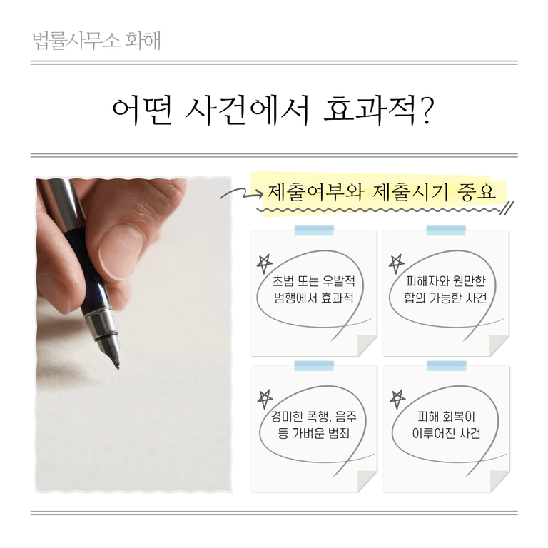 반성문이 모든 범죄에 동일한 효과를 발휘하는 것은 아닙니다. 일반적으로 초범이거나 우발적 범행, 피해자와 원만한 합의가 가능한 사건에서 반성문의 효과가 큽니다. 예를 들어 폭행, 상해, 명예훼손, 사기, 횡령, 음주운전 등 비교적 경미한 범죄나 피해 회복이 가능한 사건에서는 진심 어린 반성문이 감형에 중요한 역할을 할 수 있습니다.