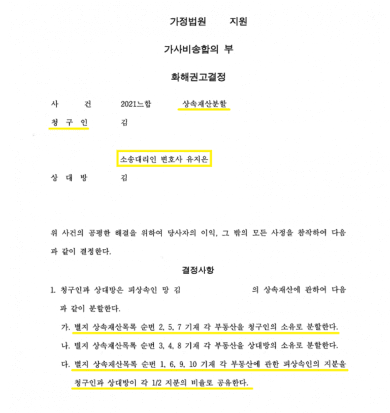결국 조정과정에서 저희가 주장한 내용이 받아들여져 법정상속분대로 나누기로 하였으며, 의뢰인이 소유하기를 원하는 가치가 큰 부동산을 단독소유로 받아올 수 있었습니다.