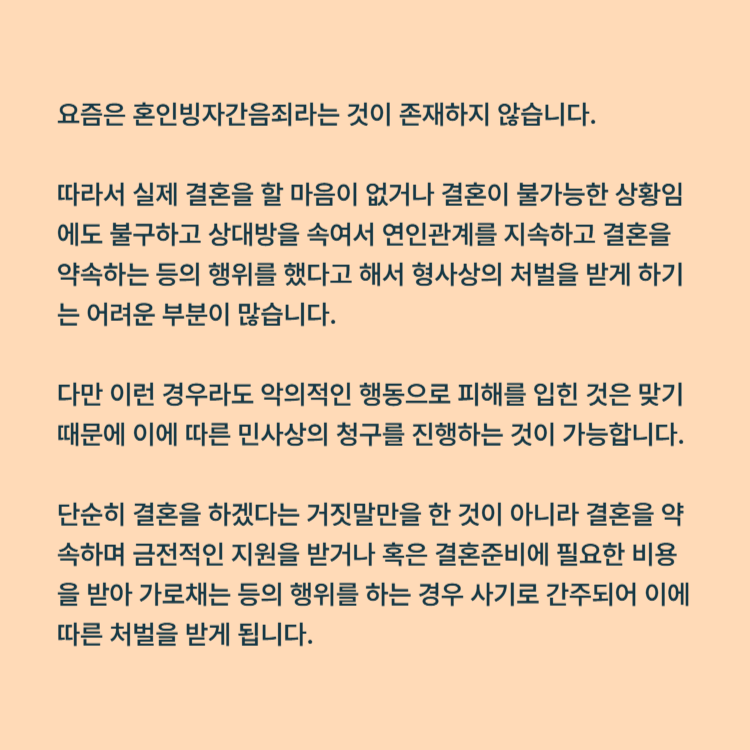 요즘은 혼인빙자간음죄라는 것이 존재하지 않습니다. 따라서 실제 결혼을 할 마음이 없거나 결혼이 불가능한 상황임에도 불구하고 상대방을 속여서 연인관계를 지속하고 결혼을 약속하는 등의 행위를 했다고 해서 형사상의 처벌을 받게 하기는 어려운 부분이 많습니다.