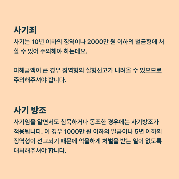 사기는 10년 이하의 징역이나 2000만 원 이하의 벌금형에 처할 수 있어 주의해야 하는데요. 피해금액이 큰 경우 징역형의 실형선고가 내려올 수 있으므로 주의해주셔야 합니다. 또한 이와 같은 결혼사기가 이루어지고 있음에도 진실을 말하지 않고 침묵하거나 동조한 경우에는 사기방조가 적용되는데요. 방조죄의 경우 1000만 원 이하의 벌금이나 5년 이하의 징역형이 선고되기 때문에 억울하게 처벌을 받는 일이 없도록 대처해주셔야 합니다.