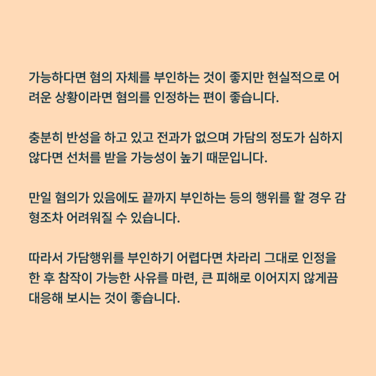 만일 혐의가 있음에도 끝까지 부인하는 등의 행위를 할 경우 감형조차 어려워질 수 있습니다. 따라서 가담행위를 부인하기 어렵다면 차라리 그대로 인정을 한 후 참작이 가능한 사유를 마련, 큰 피해로 이어지지 않게끔 대응해 보시는 것이 좋습니다.