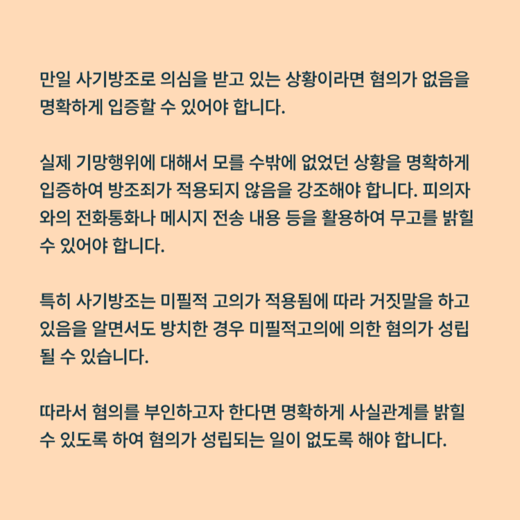 특히 사기방조는 미필적 고의가 적용됨에 따라 실질적으로 명확하게 범행에 대한 구체적 내용을 몰랐다고 할지라도 거짓말을 하고 있음을 알면서도 방치한 경우 미필적고의에 의한 혐의가 성립될 수 있습니다. 따라서 혐의를 부인하고자 한다면 명확하게 사실관계를 밝힐 수 있도록 하여 혐의가 성립되는 일이 없도록 해야 합니다.