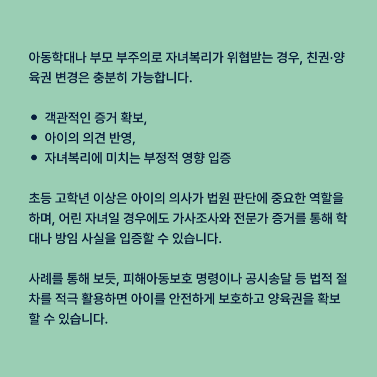 아동학대나 부모 부주의로 자녀복리가 위협받는 경우, 친권·양육권 변경은 충분히 가능합니다.