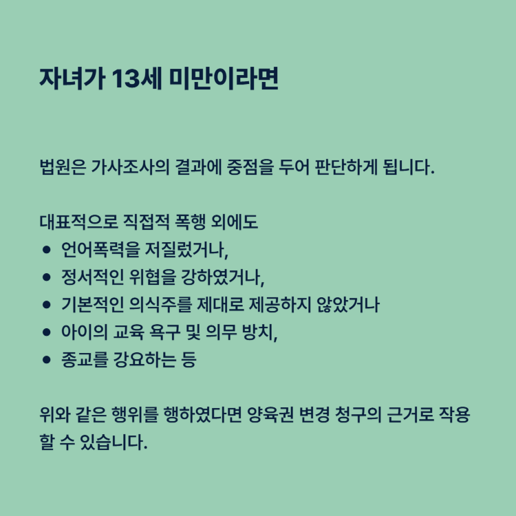 또 다른 문제는 아직 의사표현이 분명하지 않은 어린 자녀일 경우입니다. 13세 미만이라면 법원은 아이의 직접적인 의견보다는 가사조사의 결과에 중점을 두어 판단하게 됩니다. 따라서 본격적으로 변경을 요청하기 전 변호사를 통해 철저한 준비를 거쳐야 합니다.