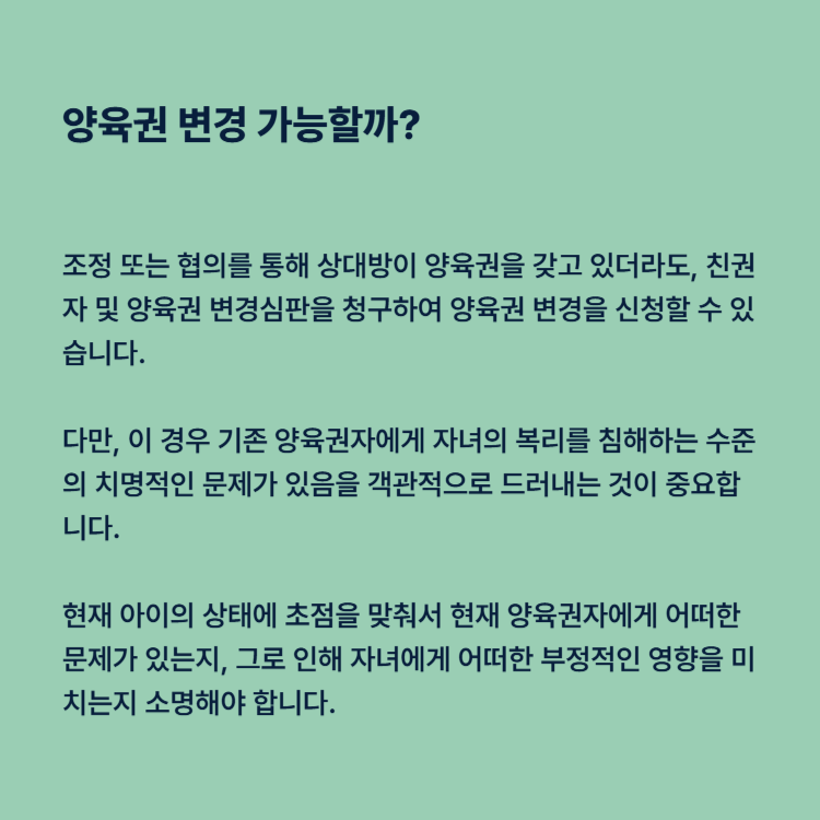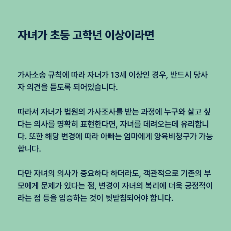 다만 자녀의 의사가 중요하다 하더라도, 객관적으로 기존의 부모에게 문제가 있다는 점, 변경이 자녀의 복리에 더욱 긍정적이라는 점 등을 입증하는 것이 뒷받침되어야 합니다. 법정에서 논리적으로 진술하는 일 역시 쉽지 않으니, 사전에 관련 절차에 대해 잘 아는 변호사를 만나 함께 상담을 받아 보시기 바랍니다.