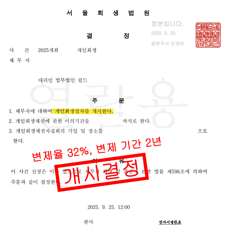 그 결과, 총 채무액 133,705,838원 중 약 32.13%를 2년간 변제하는 내용의 회생절차 개시결정이 내려졌습니다.