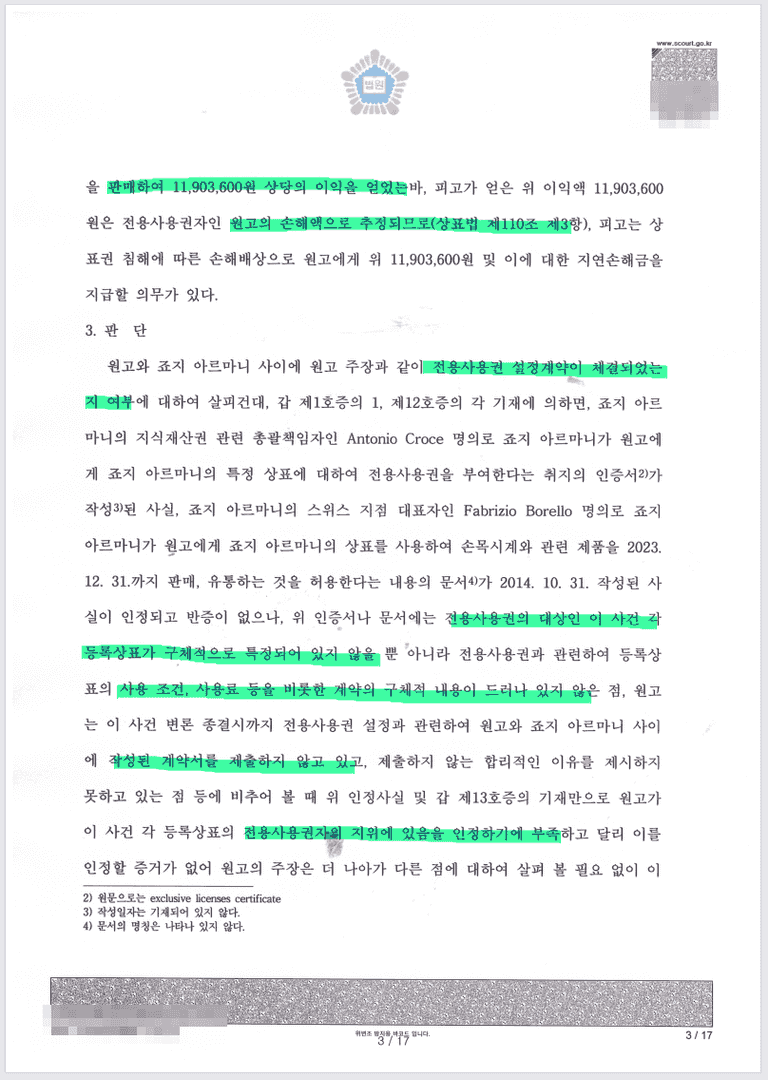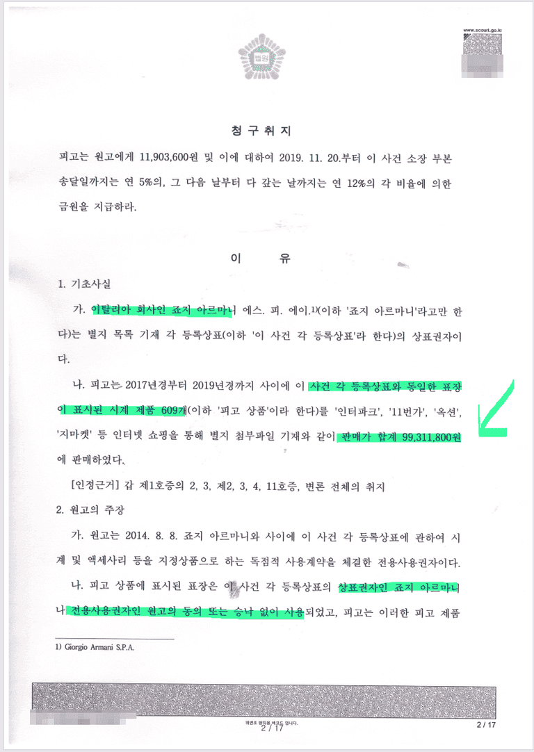 조르지오 아르마니 전용사용권 침해했다고 주장하면서