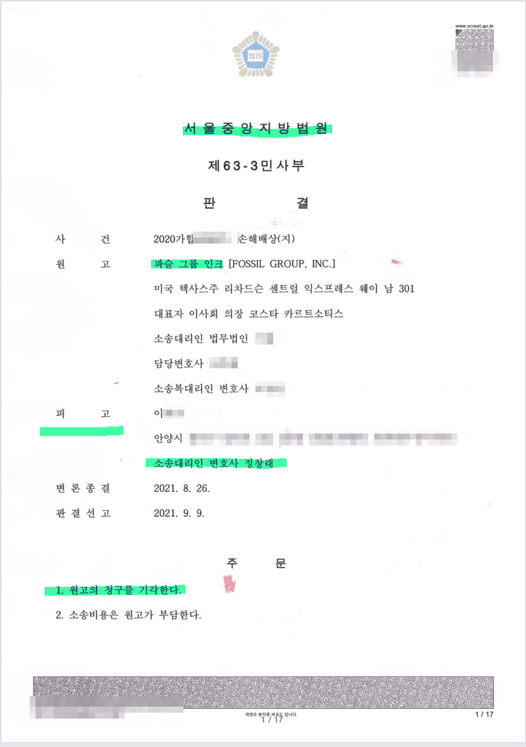 손배소송 제기 - 피고측 대리하여 전부승소
