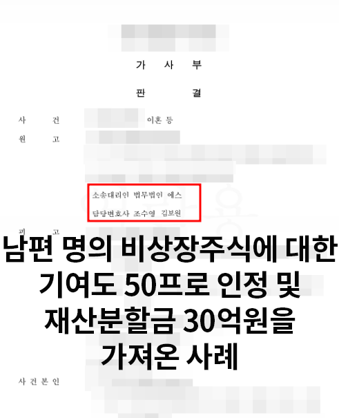 남편 명의 비상장주식에 대한 기여도 50프로 인정 및 재산분할금 30억원을 가져온 사례