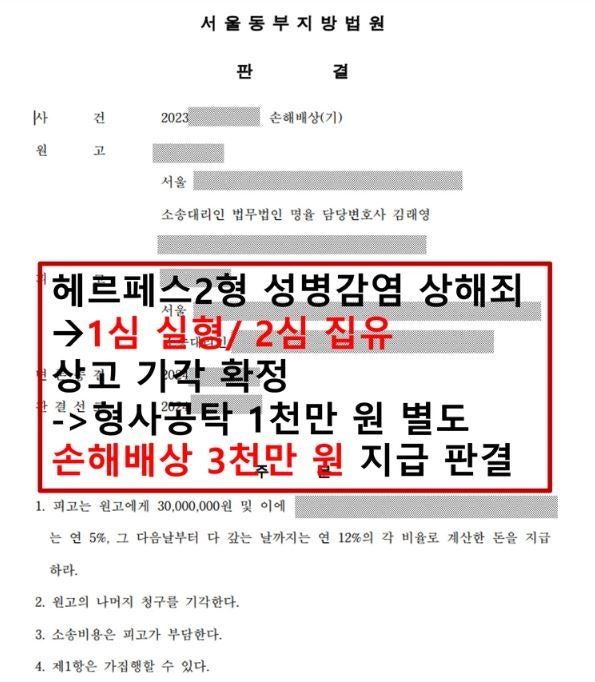 제가 직접 진행한 한 사건에서는, 피고가 성관계 후 원고가 헤르페스 2형 바이러스에 감염되었음에도 이를 부인한 사례입니다. 가해자 측에서는 소변검사 결과를 근거로 무혐의를 주장했으나, 전문가들은 정확한 감염 여부는 혈액검사를 통해 확인해야 한다고 밝혔습니다.