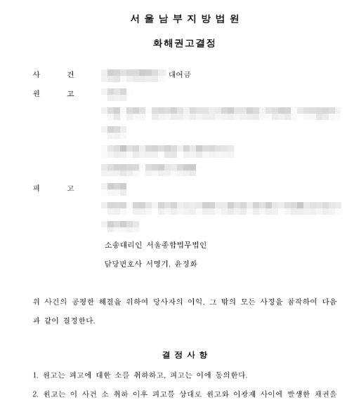 금융거래내역서 제출, 사실확인서 제출, 사진 자료 제출 및 증인신청 등을 통하여 처분문서의 위조에 대하여 항변하였고 결정적으로 상대가 신청한 증인으로부터 오히려 유리한 진술을 얻게 되어(개인적으로 민사소송 절차의 꽃이 반대신문이라고 생각하는데, 바로 이 사건도 반대신문에 의하여 원고가 소송을 취하하게 되었습니다) 원고는 소송을 취하할 수밖에 없는 내용으로 화해권고 결정을 따를 수밖에 없게 되었고 의뢰인분은 차용금을 한 푼도 지급하지 않은 채 연대보증채무에서 완전히 해방될 수 있었습니다.
