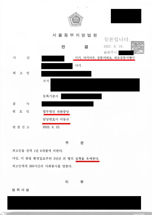 재판부는 이동규 변호사의 주장을 받아들여 의뢰인에게 집행유예형을 선고하였습니다.