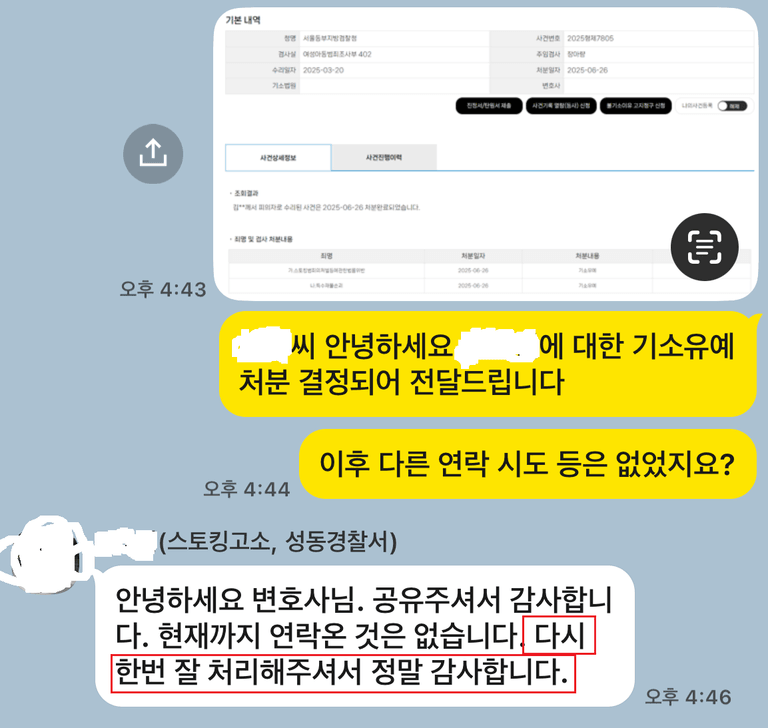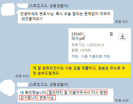 가해자가 의뢰인뿐만 아니라 박성욱 변호사에게까지 연락 및 협박을 시도하는 상황에서도, 박성욱 변호사는 흔들림 없이 단호한 법적 입장을 유지했습니다. 이러한 변호사의 꺾이지 않는 태도가 상대방의 기세를 꺾고 부당한 요구를 철회하게 만든 결정적인 요인이었습니다.