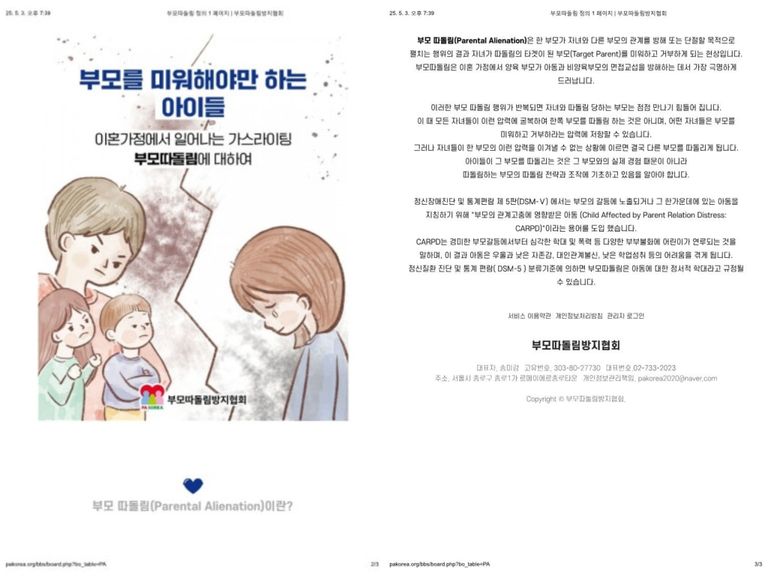 그러한 결과 “부모 따돌림”이라는 신조어까지 발생한 것입니다. 부모 따돌림(Parental Alienation)이란 한 부모가 자녀와 다른 부모의 관계를 방해 또는 단절할 목적으로 펼치는 행위의 결과 자녀가 따돌림의 타겟이 된 부모(Target Parent)를 미워하고 거부하게 되는 현상을 말하는 것입니다(부모 따돌림 협회에서 인용).