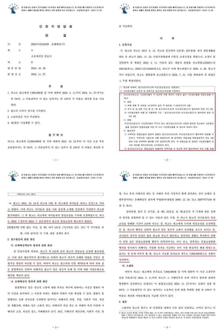 [피고가 원고의 자녀들과의 면접교섭을 방해한 기간이 2년에 이르는 점 등의 사정으로 불법행위가 인정된 사례 : 인천지방법원 2024. 11. 27. 선고 2024가단242499 판결]