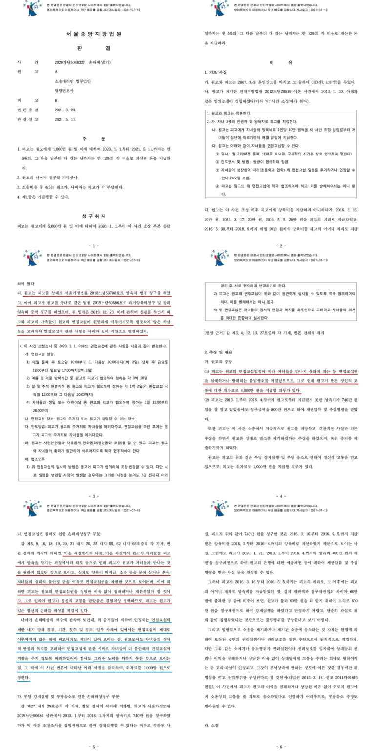 [피고는 원고의 면접교섭일정에 따라 자녀들을 만나지 못하게 하는 등 면접교섭권을 침해하거나 방해한 불법행위가 인정된 사례 : 서울중앙지방법원 2021. 5. 11. 선고 2020가단5048327 판결]