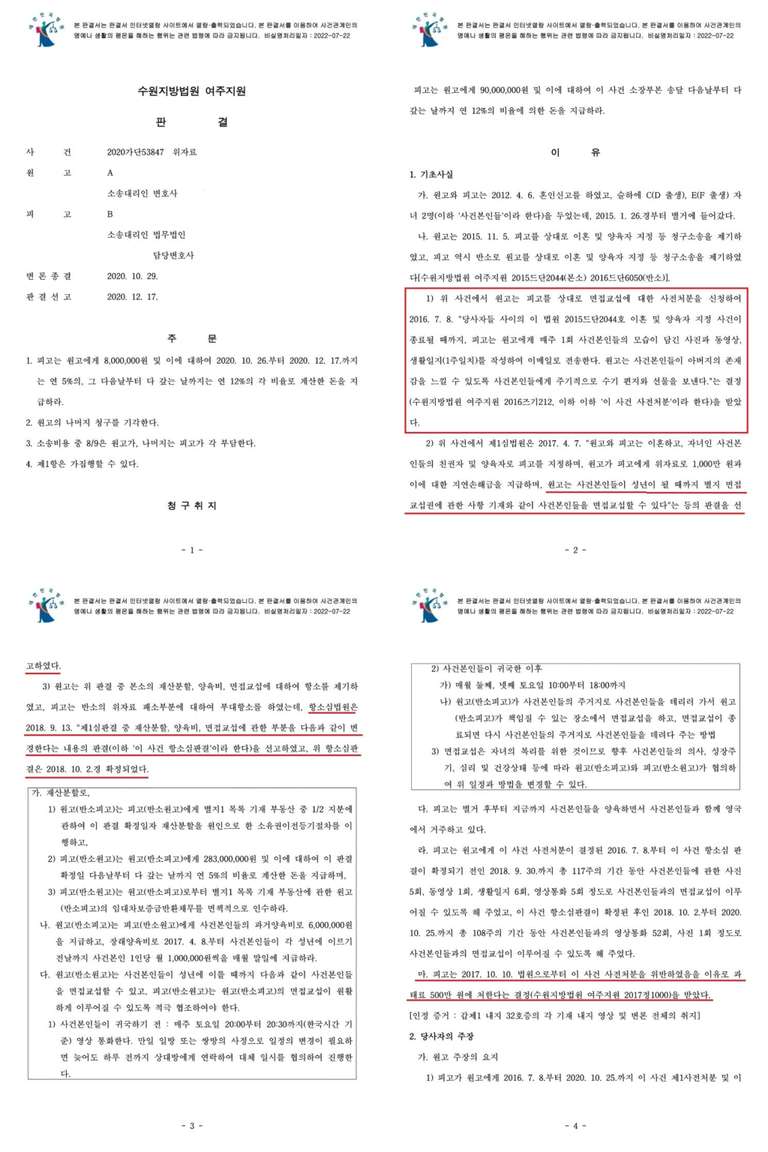 3) 원고는 위 판결 중 본소의 재산분할, 양육비, 면접교섭에 대하여 항소를 제기하였고, 피고는 반소의 위자료 패소부분에 대하여 부대항소를 하였는데, 항소심법원은 2018. 9. 13. ”제1심판결 중 재산분할, 양육비, 면접교섭에 관한 부분을 다음과 같이 변경한다는 내용의 판결(이하 ’이 사건 항소심판결‘이라 한다)을 선고하였고, 위 항소심판결은 2018. 10. 2.경 확정되었다.