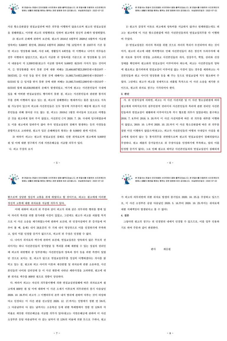“피고는 이 사건 사전처분 및 이 사건 항소심판결에 따라 원고에게 아버지로서의 천부인권적 권리이자 사건본인들의 복리에 관한 권리인 사건본인들과의 면접교섭이 원활하게 이루어지도록 적극 협조할 의무가 있었음에도 불구하고 2016. 7. 8.부터 2018. 9. 30.까지 이 사건 사전처분에 따른 위 의무를 대부분 이행하지 않았고, 2019. 10. 1.부터 2020. 10. 25.까지 이 사건 항소심판결에 따른 위 의무를 절반 이상 이행하지 않았으며(원고는, 피고가 사건본인들의 여행과 국내입국 사실을 원고에게 알리지 않는 등 통지의무를 위반함으로써 원고의 면접교섭권이 침해되었다고 주장하나, 원고 제출의 증거들만으로 위 주장사실을 인정하기에 부족하고, 달리 이를 인정할 증거가 없다), 그로 인해 원고로 하여금 사건본인들과의 면접교섭권이 침해되게 함으로써 상당한 정신적 고통을 겪게 하였다고 할 것이므로, 피고는 원고에게 이러한 정신적 고통에 대한 위자료를 지급할 의무가 있다.”고 판단하였습니다.
