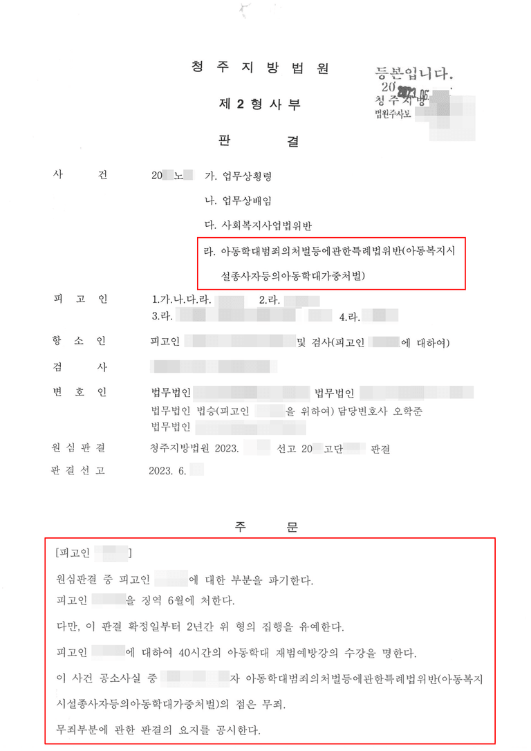 그 결과 의뢰인은 방임행위 부분에 대해서 ‘의뢰인이 이 사건 범행 당시 아동 A가 아동 B의 성기를 만지는 것을 목격하고도 이를 방임하였다는 점이 합리적 의심을 배제할 정도로 증명되었다고 보기에 부족하고, 달리 이를 인정할 증거가 없다’라는 무죄 판결을 받을 수 있었고, 선고형도 징역 8월에서 징역 6월로 감축되었고, 5년간 아동관련기관 취업제한 명령도 파기되었습니다.