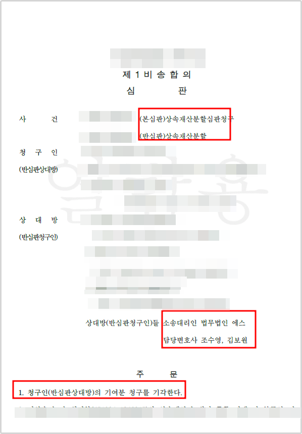 그 결과 법원에서도 저희 측 주장을 받아들여 계부의 기여분청구를 모두 기각하였고, 계부가 상당한 돈을 특별수익한 점을 인정하여 계부의 상속분이 법정상속분보다 1/2이나 감축되게 되었습니다.