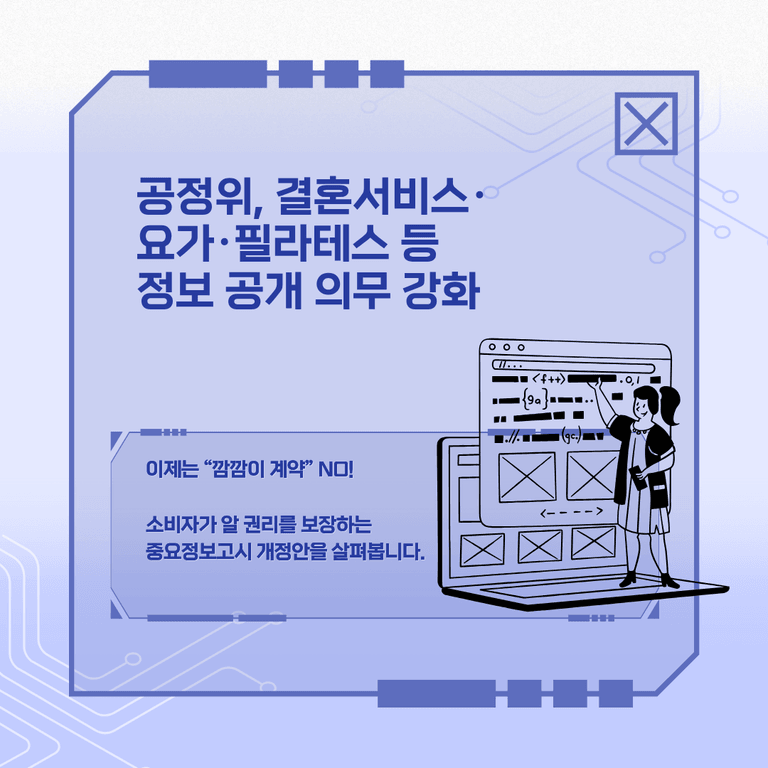 ![[표시광고#3]공정위, 결혼서비스 및 요가·필라테스 등 특정 업종 정보 공개 의무 강화](/_next/image?url=https%3A%2F%2Fd2ai3ajp99ywjy.cloudfront.net%2Fuploads%2Ftitleimage%2Foriginal%2F5b19e5ded64c1b0b5924b00f-original.jpg&w=3840&q=75)