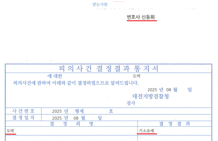 수사기관은 변호인이 제출한 자료와 의견서를 종합적으로 검토한 결과, 의뢰인의 도박행위가 상습적이거나 불법 스포츠도박으로 볼 만한 증거가 없고, 의뢰인이 깊이 반성하며 재범방지를 위해 노력하고 있음을 인정하였습니다. 이에 따라 검찰은 의뢰인에 대하여 ‘기소유예 처분’을 내렸습니다. 즉, 의뢰인은 형사재판에 회부되지 않고 형벌을 면하게 되었으며, 전과기록 또한 남지 않게 되었습니다.