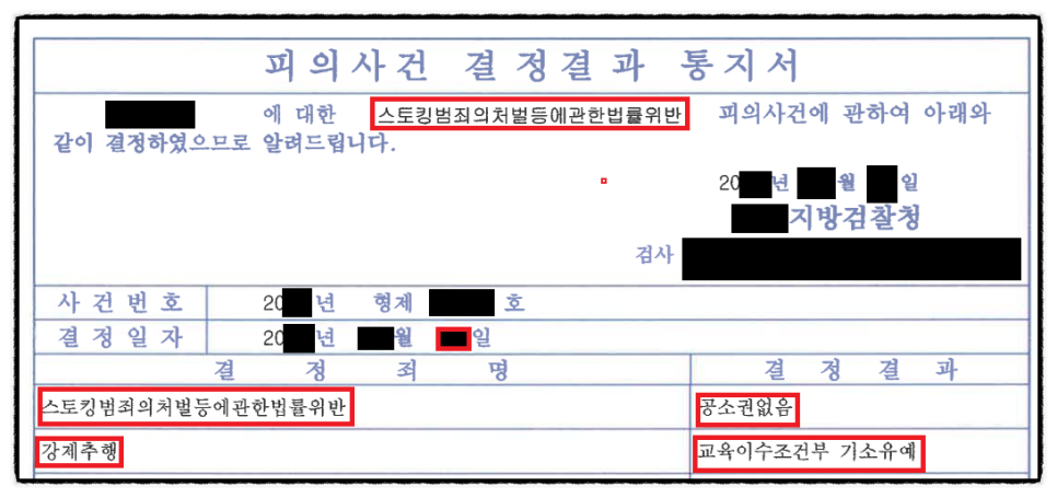 이러한 합의와 강력한 무혐의 주장 결과 수사기관은 스토킹처벌법위반 혐의에 대하는 공소권없음 처분을, 강제추행 혐의에 대하여는 교육조건부 기소유예 처분을 하였습니다.