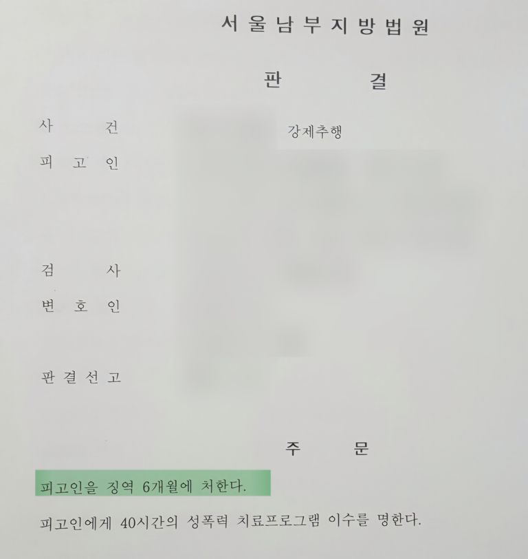 이 사안은 가해자가 범행을 강하게 부인하였기 때문에 당연히 합의는 이루어지지 않았습니다. 이 사안은 2회에 걸친 범행이었고 신체접촉의 수위가 높은 편이었으며, 수사과정 및 재판과정에서 회원들에게 허위 진술을 유도하고 피해자도 회유한 정황이 드러났기 때문에 그러한 점이 양형에 영향을 미쳐서 이례적으로 징역6월의 실형이 선고되었습니다.