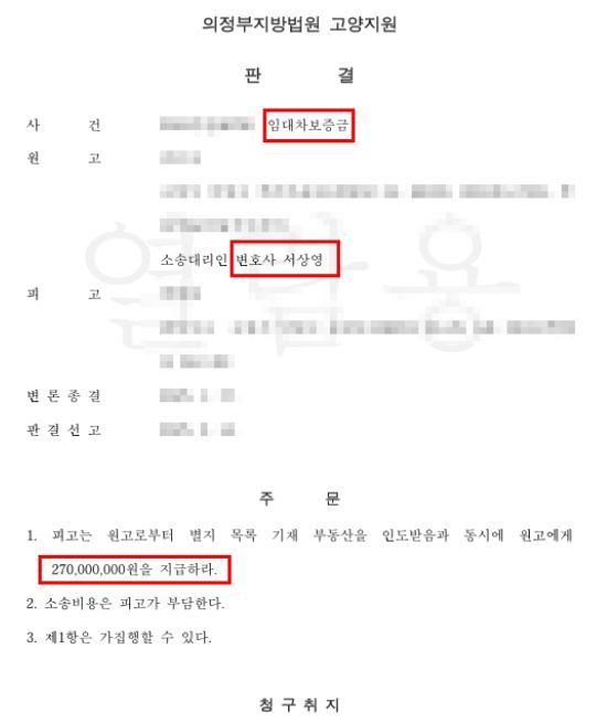 법원은 저의 주장을 모두 받아들여 임대인은 의뢰인에게 보증금 전액을 반환하라는 판결을 선고하였습니다.