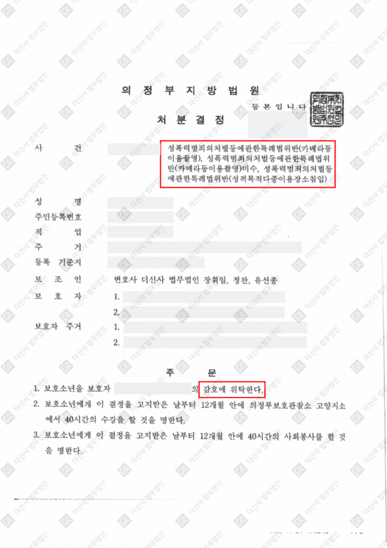 소년부는 해당 사건에 대해 형사처벌이나 소년원 송치 대신, 감호 위탁(보호자 또는 위탁기관의 감독 하에 생활)이라는 보호처분을 결정하였습니다.
