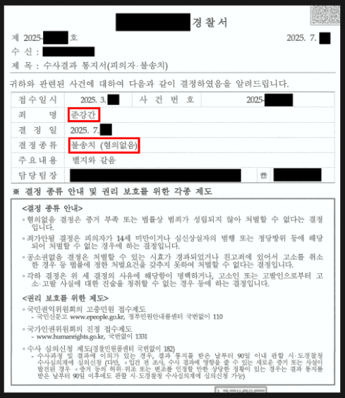 이 사건은 바로 그 ‘고의의 존재’가 불명확할 때 불송치로 귀결될 수 있음을 보여주는 대표적 사례라 할 수 있습니다.