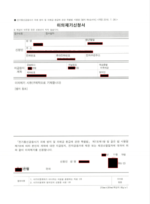 그 방법은 은행에 즉시 이의신청서를 접수해야 하는데, 이의신청 사유와 이를 뒷받침하는 객관적인 근거자료(거래내역, 문자메시지, 통화녹음파일 등등)를 통해 범죄와는 아무런 연루가 되어 있지 않다는 것을 설득력 있게 작성해야 한다.