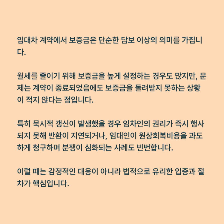 임대차 계약에서 보증금은 단순한 담보 이상의 의미를 가집니다. 월세를 줄이기 위해 보증금을 높게 설정하는 경우도 많지만, 문제는 계약이 종료되었음에도 보증금을 돌려받지 못하는 상황이 적지 않다는 점입니다.