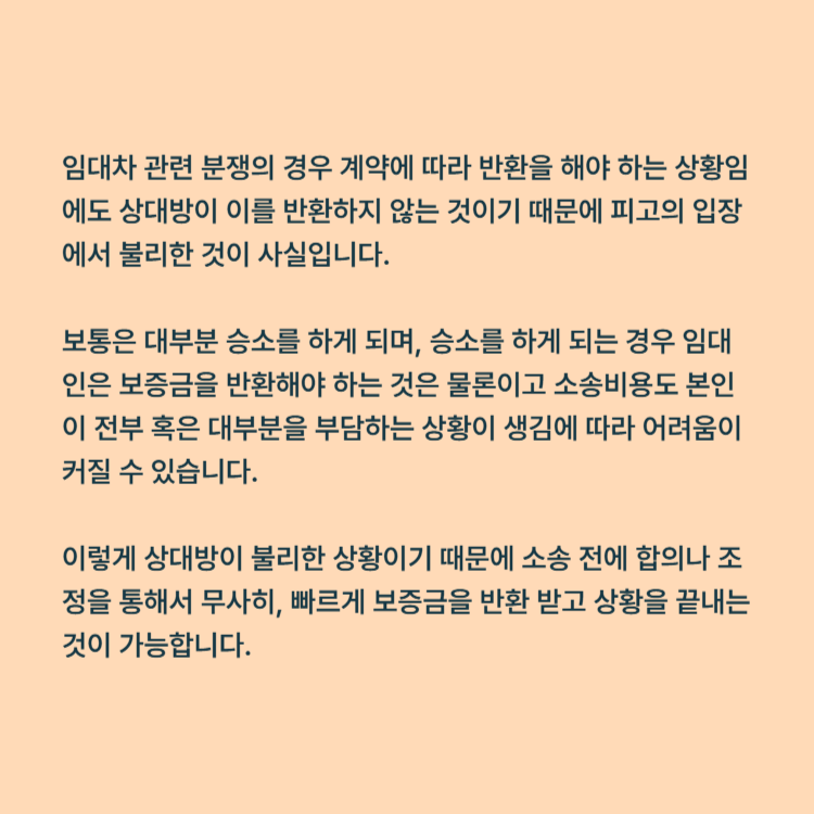 임대차 관련 분쟁의 경우 계약에 따라 반환을 해야 하는 상황임에도 상대방이 이를 반환하지 않는 것이기 때문에 피고의 입장에서 불리한 것이 사실입니다. 보통은 대부분 승소를 하게 되며, 승소를 하게 되는 경우 임대인은 보증금을 반환해야 하는 것은 물론이고 소송비용도 본인이 전부 혹은 대부분을 부담하는 상황이 생김에 따라 어려움이 커질 수 있습니다. 이렇게 상대방이 불리한 상황이기 때문에 소송 전에 합의나 조정을 통해서 무사히, 빠르게 보증금을 반환 받고 상황을 끝내는 것이 가능한데요. 변호사를 선임할 경우 상대방에게 소송을 불사하겠다는 의지를 보일 수가 있는 것은 물론이고 직접 합의나 조정에 개입하여 사건을 조금 더 빠른 시일 내로 마무리할 수 있게 도움을 받아 보실 수 있습니다.