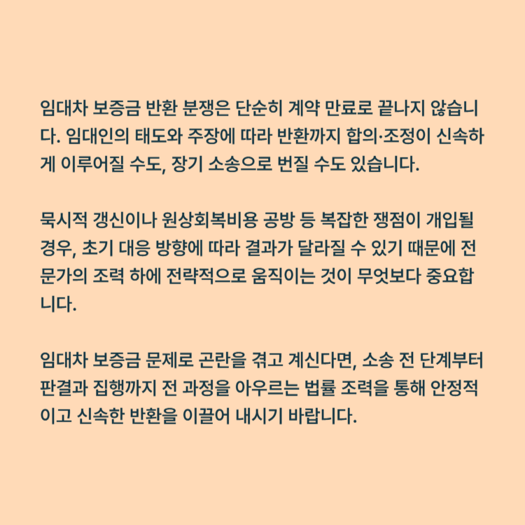 임대차 보증금 반환 분쟁은 단순히 계약 만료로 끝나지 않습니다. 임대인의 태도와 주장에 따라 반환까지 합의·조정이 신속하게 이루어질 수도, 장기 소송으로 번질 수도 있습니다.