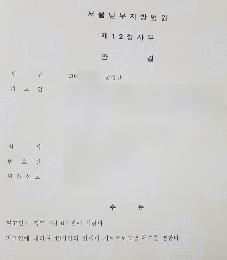 가해자측에서 적극적으로 무죄를 다투었기 때문에 피해자가 법정에 출석하여 증인신문을 한 사례입니다. 이 사안은 징역2년6월의 실형이 선고되었습니다.