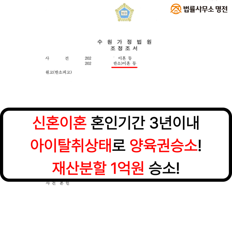 📌재산분할 신혼이혼 3년이내 감안, 기여도 최대인정 재산분할 1억원 승소!