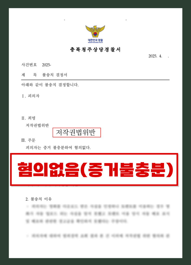 그 결과 경찰은 의뢰인에게 범행에의 고의가 없다는 취지로 불송치결정을 하였고, 이후 검찰에서도 같은 취지로 판단하여 무혐의로 사건이 종결되었습니다.