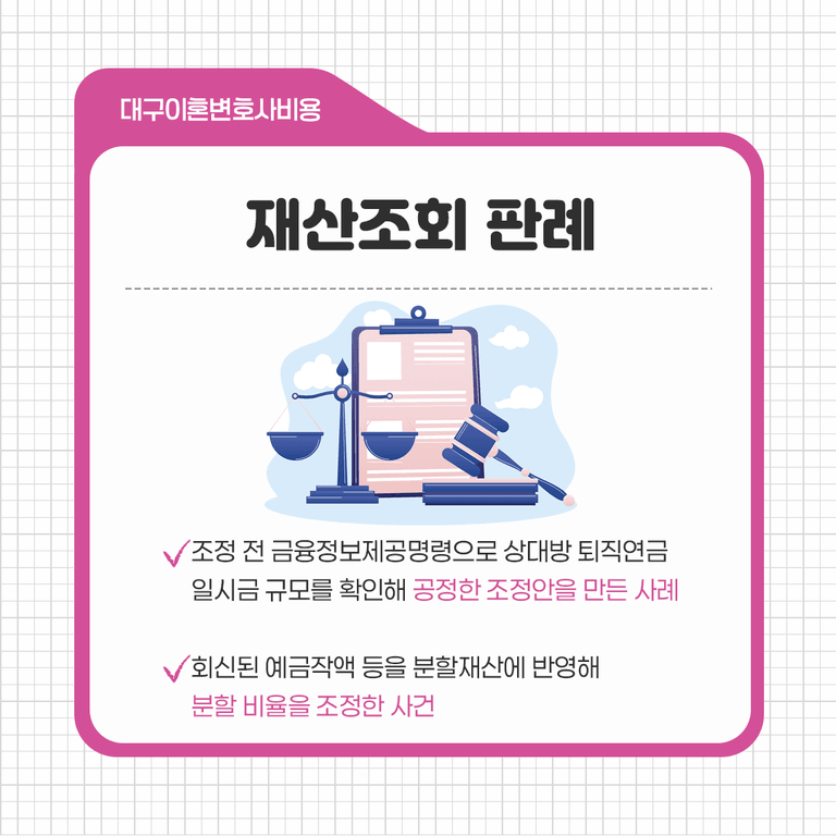 조정 전 금융정보제공명령으로 상대방 퇴직연금 일시금 규모를 확인해 공정한 조정안을 만든 사례가 있습니다.