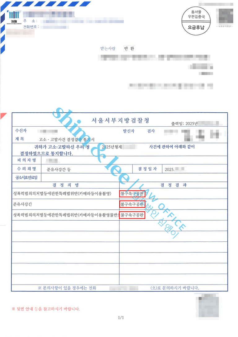 검사님은 피해자 진술의 신빙성이 매우 높다고 판단하였고, 결국 가해자는 카메라등이용촬영, 카메라등이용촬영물반포등, 준유사강간 혐의로 불구속 구공판 처분을 받게 되었습니다.