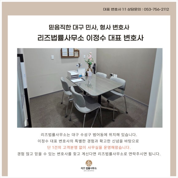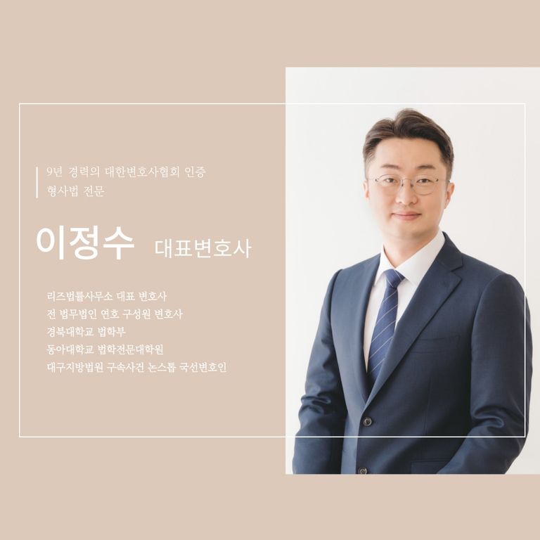 안녕하세요. 9년 동안 대구·경북 지역에서 형사사건을 전담해오고 있는 리즈 법률사무소 이정수 대표 변호사입니다.