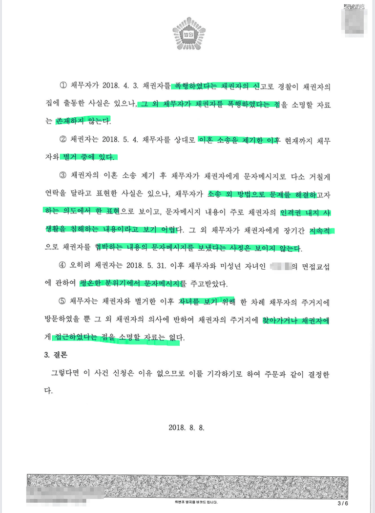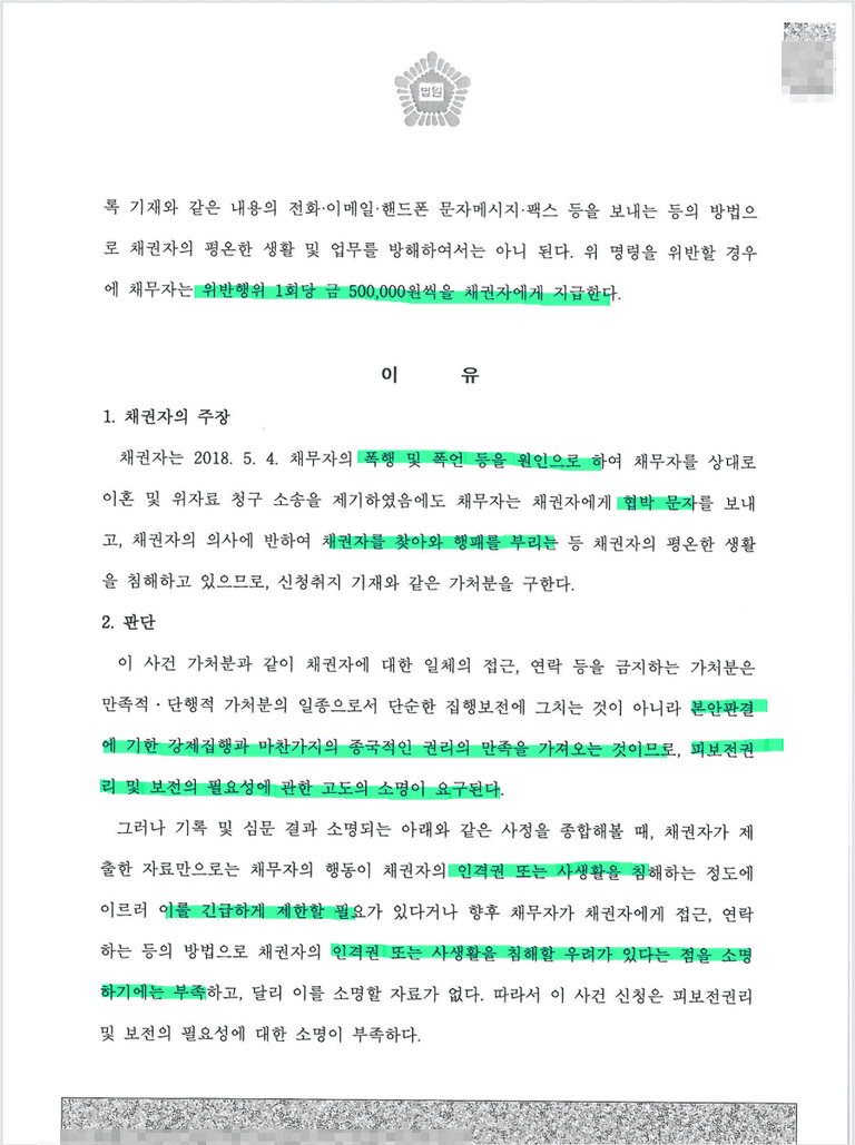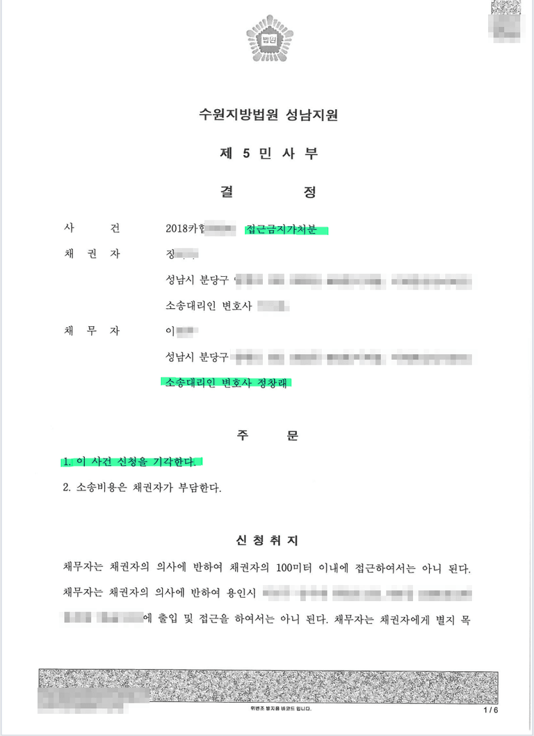 이 정도 소명만으로는 접근금지가처분을 인정하지 못하겠다는 결정을 받아낸 사례