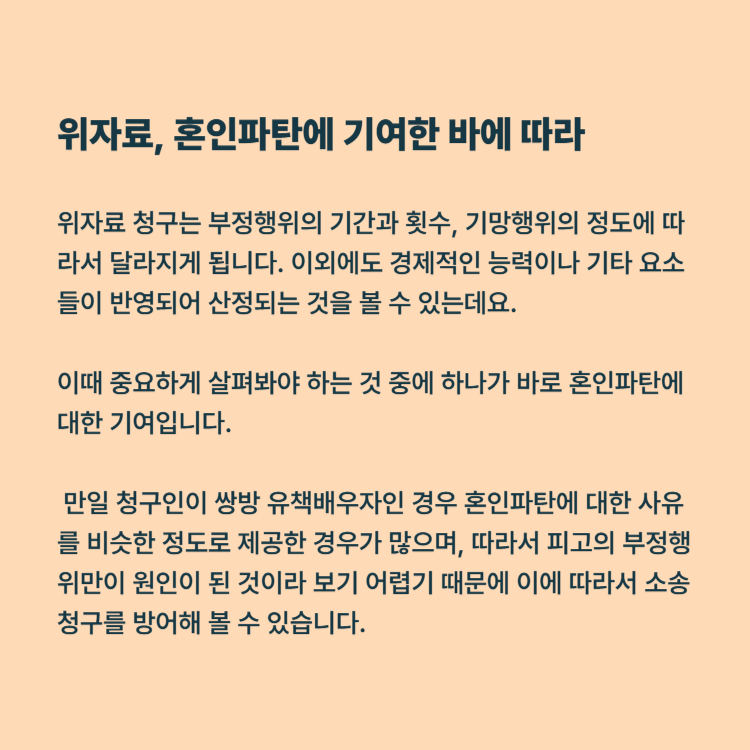 위자료 청구는 부정행위의 기간과 횟수, 기망행위의 정도에 따라서 달라지게 됩니다. 이외에도 경제적인 능력이나 기타 요소들이 반영되어 산정되는 것을 볼 수 있는데요. 이때 중요하게 살펴봐야 하는 것 중에 하나가 바로 혼인파탄에 대한 기여입니다. 만일 청구인이 쌍방 유책배우자인 경우 혼인파탄에 대한 사유를 비슷한 정도로 제공한 경우가 많으며, 따라서 피고의 부정행위만이 원인이 된 것이라 보기 어렵기 때문에 이에 따라서 소송 청구를 방어해 볼 수 있습니다.