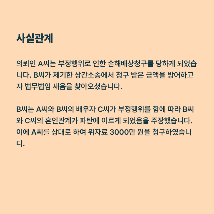 B씨는 A씨와 B씨의 배우자 C씨가 부정행위를 함에 따라 B씨와 C씨의 혼인관계가 파탄에 이르게 되었음을 주장했습니다. 이에 A씨를 상대로 하여 위자료 3000만 원을 청구하였는데요. 법무법인 새움에서는 B씨가 제출한 해당 이혼 사건의 조정조서에 B씨가 C씨에 대해서 지나친 간섭을 하고 통제를 한 것과 C씨가 A씨와 교제하는 등의 부정행위로 인해서 혼인관계가 파탄에 이르렀음을 확인한다 라고 명시되어 있는 점을 이용했습니다.