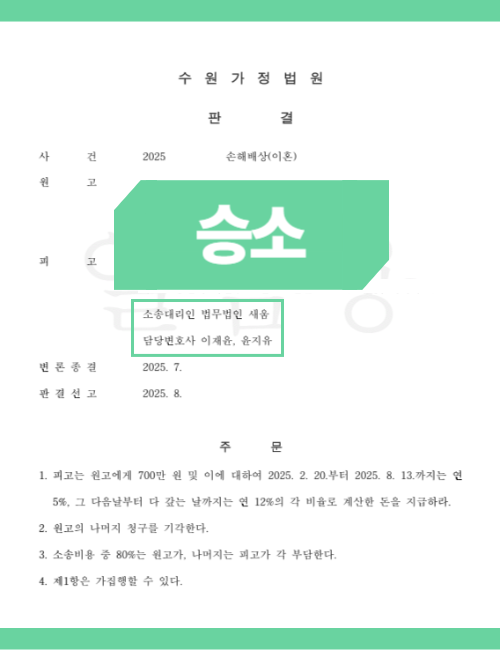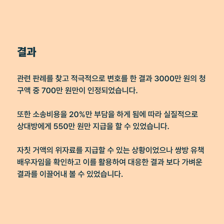 또한 소송비용을 20%만 부담을 하게 됨에 따라 실질적으로 상대방에게 550만 원만 지급을 할 수 있었습니다. 자칫 거액의 위자료를 지급할 수 있는 상황이었으나 쌍방 유책배우자임을 확인하고 이를 활용하여 대응한 결과 보다 가벼운 결과를 이끌어내 볼 수 있었습니다.