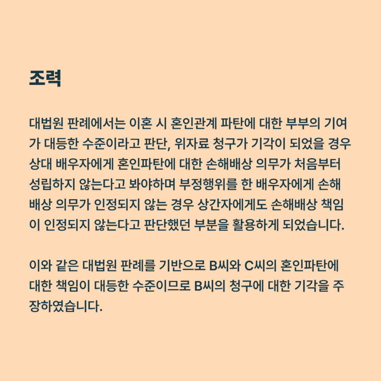 B씨는 C씨의 일방적인 부정행위로 인한 혼인관계 파탄이라고 주장하며 C씨를 상대로 위자료를 청구했는데요. 대법원 판례에서는 이혼 시 혼인관계 파탄에 대한 부부의 기여가 대등한 수준이라고 판단, 위자료 청구가 기각이 되었을 경우 상대 배우자에게 혼인파탄에 대한 손해배상 의무가 처음부터 성립하지 않는다고 봐야하며 부정행위를 한 배우자에게 손해배상 의무가 인정되지 않는 경우 상간자에게도 손해배상 책임이 인정되지 않는다고 판단했던 부분을 활용하게 되었습니다. 이와 같은 대법원 판례를 기반으로 B씨와 C씨의 혼인파탄에 대한 책임이 대등한 수준이므로 B씨의 청구에 대한 기각을 주장하였습니다.