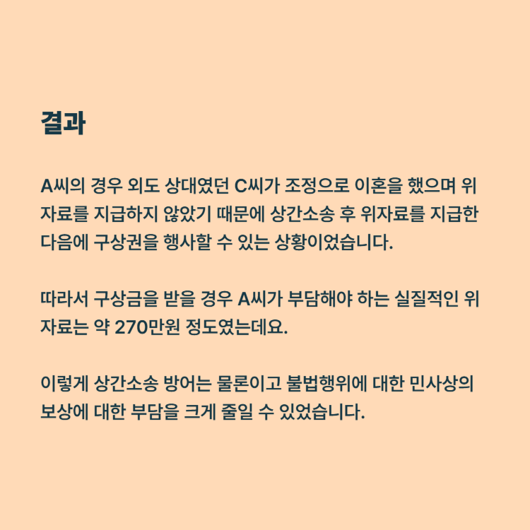 A씨의 경우 외도 상대였던 C씨가 조정으로 이혼을 했으며 위자료를 지급하지 않았기 때문에 상간소송 후 위자료를 지급한 다음에 구상권을 행사할 수 있는 상황이었습니다. 따라서 구상금을 받을 경우 A씨가 부담해야 하는 실질적인 위자료는 약 270만원 정도였는데요. 이렇게 상간소송 방어는 물론이고 불법행위에 대한 민사상의 보상에 대한 부담을 크게 줄일 수 있었습니다.