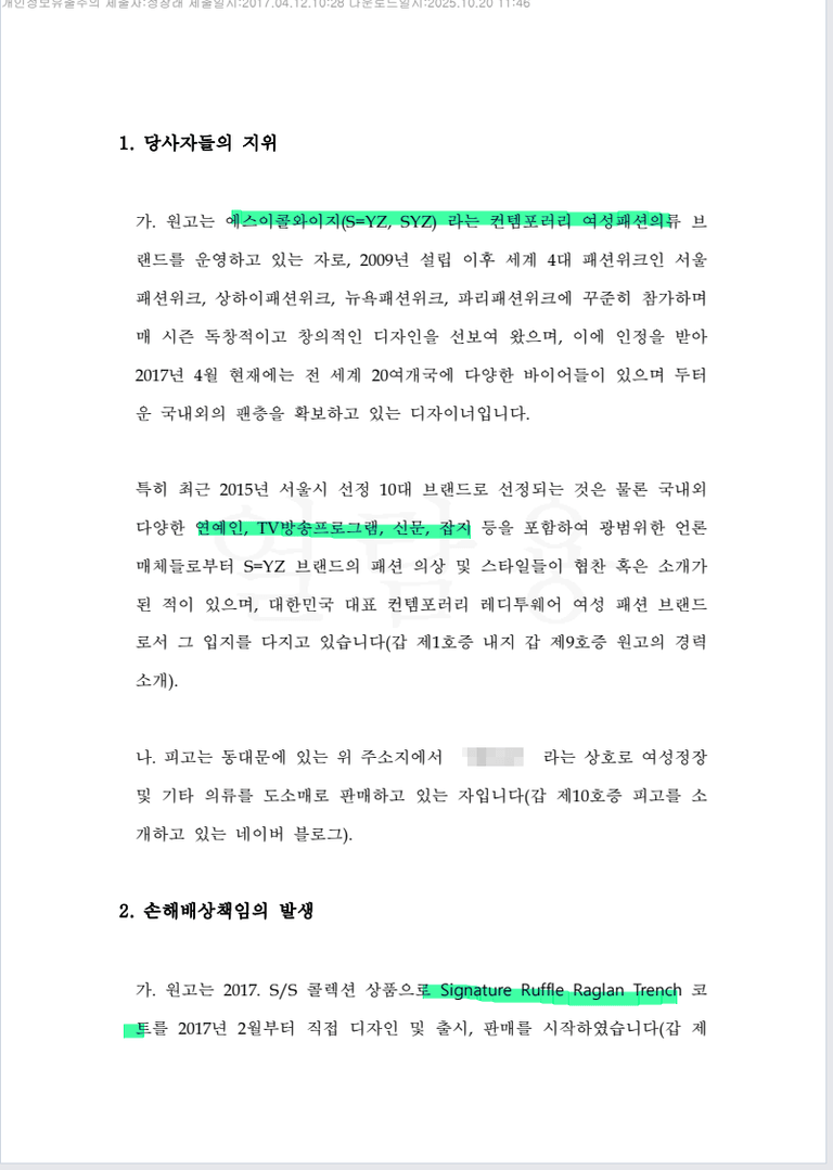 원고는 유명 디자이너로 유명연예인에게 의류를 입히는 등 광고활동을 하고 패션잡지, 패션위크 등 다양한 홍보활동을 하여 인지도를 넓혀 온 바 있는 자로,