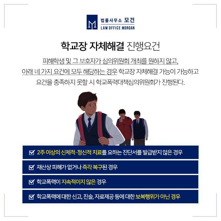 이를 토대로 학교장자체해결 요건을 충족하는지를 살펴보는데요. 학교장자체해결에 해당되려면 아래 요건을 충족하여야 합니다.