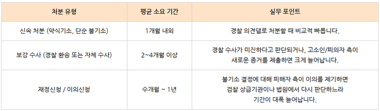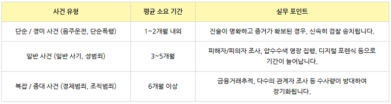 형사사건 처리 단계별 평균 소요 기간 (실무 경험 기반)